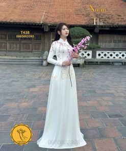 Áo Dài Xuân Thì – Họa Tiết Hoa Đào Đón Tết – Hoàng Cẩm Chi – Màu Trắng in Hoa Đào – Vải Lụa Cao Cấp