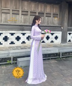 Áo dài gấm tơ tằm Đông Hưng – Hoàng Cẩm Chi – Chất liệu Cao Cấp – Họa Tiết Hoa Trà – Màu Tím Mộng Mer