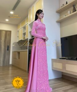 Áo dài nhung kim sa lấp lánh màu hồng Baby thương hiệu Hoàng Cẩm Chi