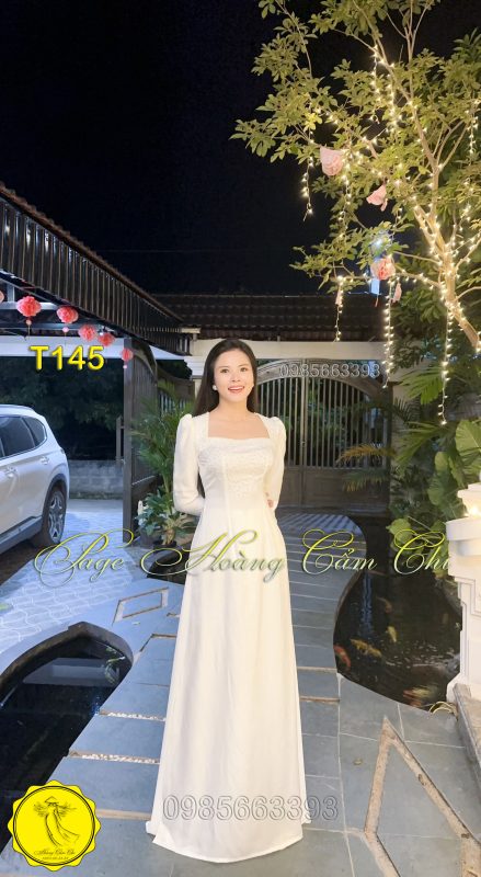 Mẫu áo dài trắng T145 với thiết kế cổ vuông cổ điển, tay phồng thanh lịch, tôn lên nét đẹp nữ tính và tinh khôi.