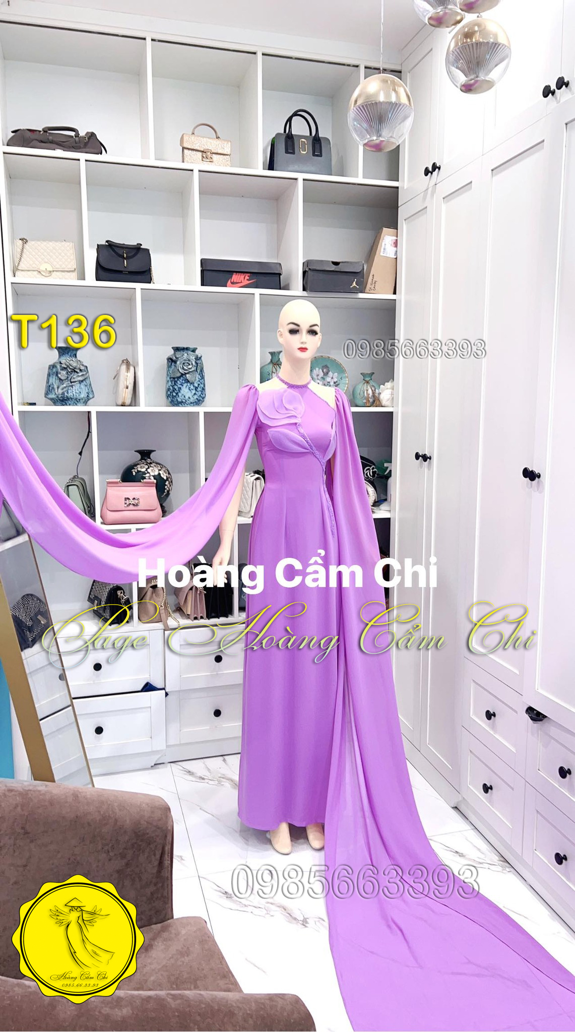 Mẫu áo dài T136 nổi bật với sắc tím thơ mộng cùng thiết kế tay cape bay bổng, mang lại vẻ đẹp vừa truyền thống, vừa hiện đại.