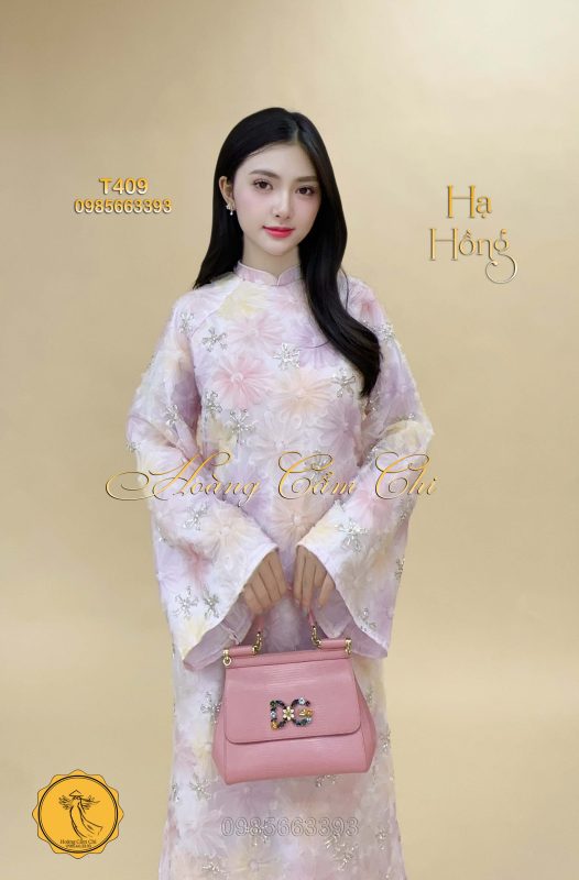 Thiết kế Áo Dài T409 đưa nàng vào khu vườn thơ mộng với tông màu hồng tím pastel độc đáo. Chất liệu thêu hoa nổi cùng điểm xuyết hạt đá lấp lánh nhẹ nhàng, tạo nên vẻ đẹp ngọt ngào và vô cùng tinh tế.
