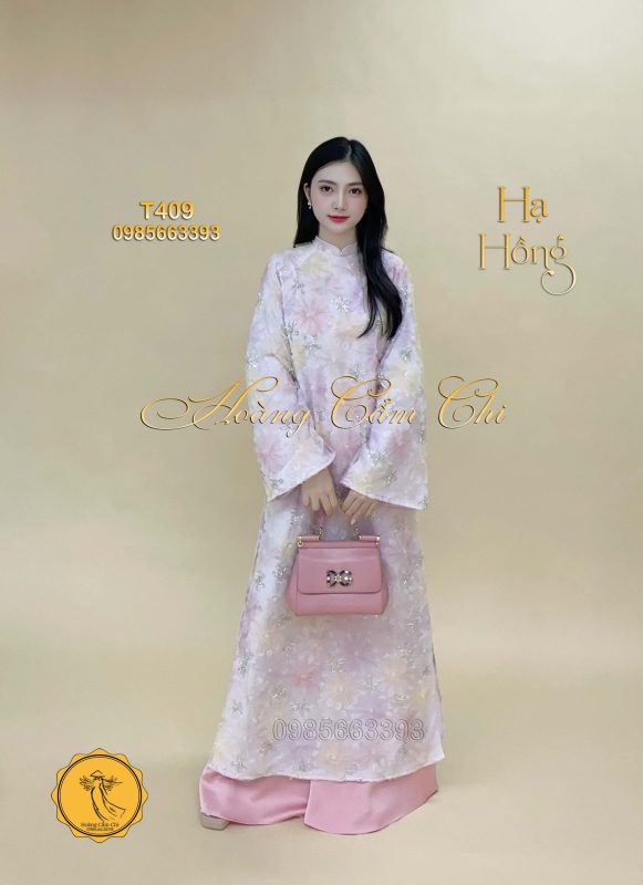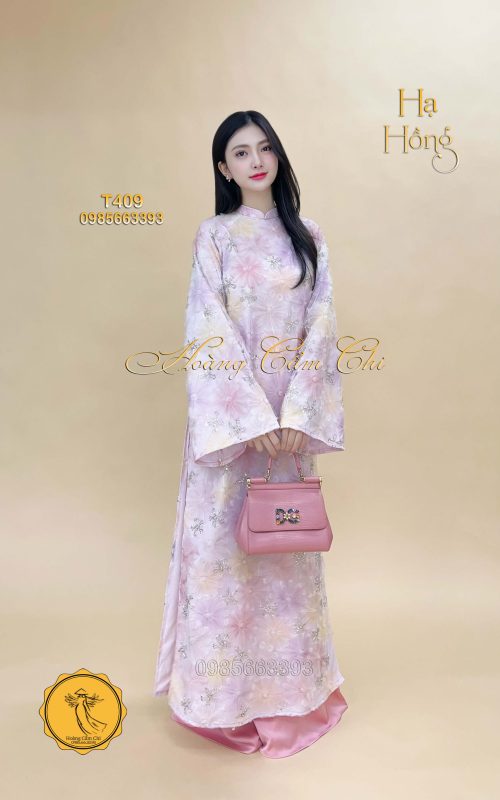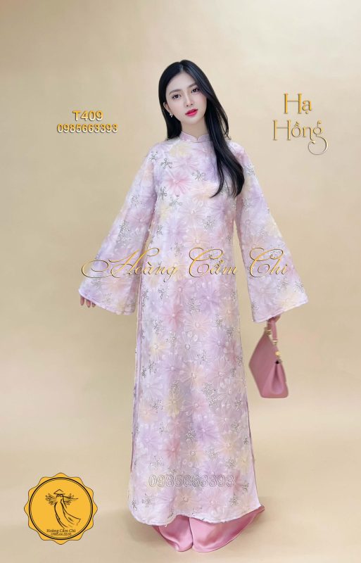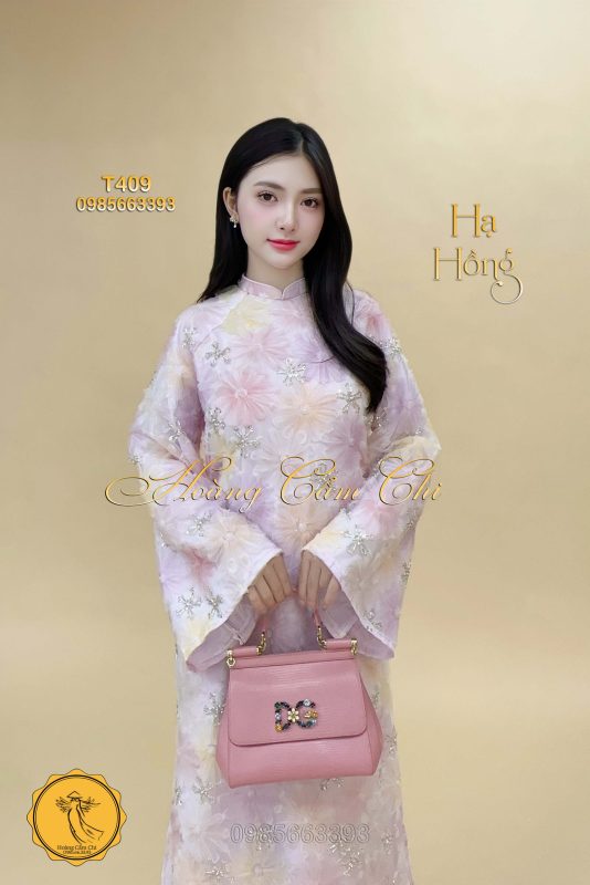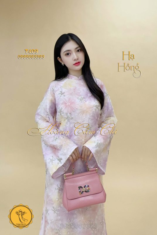 Thiết kế Áo Dài T409 đưa nàng vào khu vườn thơ mộng với tông màu hồng tím pastel độc đáo. Chất liệu thêu hoa nổi cùng điểm xuyết hạt đá lấp lánh nhẹ nhàng, tạo nên vẻ đẹp ngọt ngào và vô cùng tinh tế.