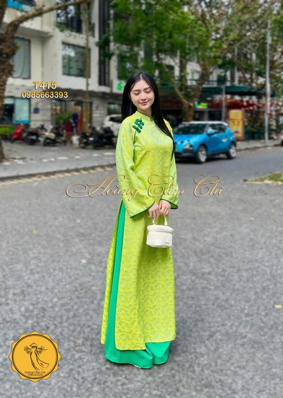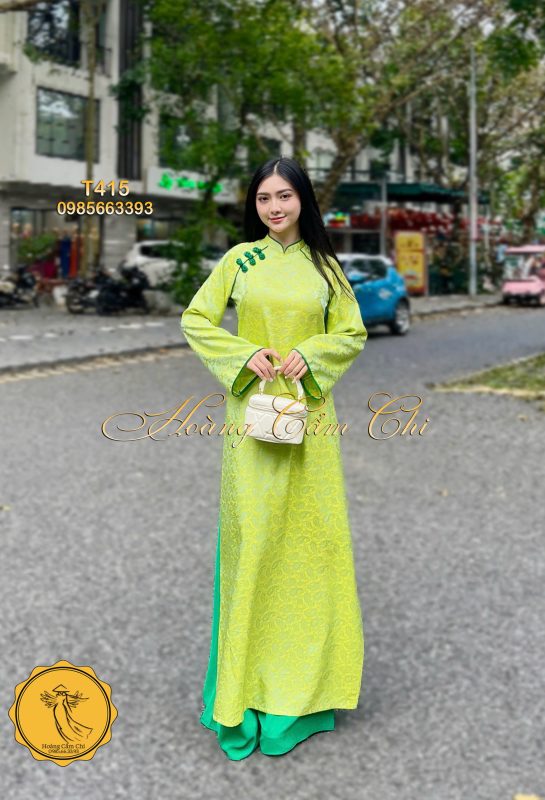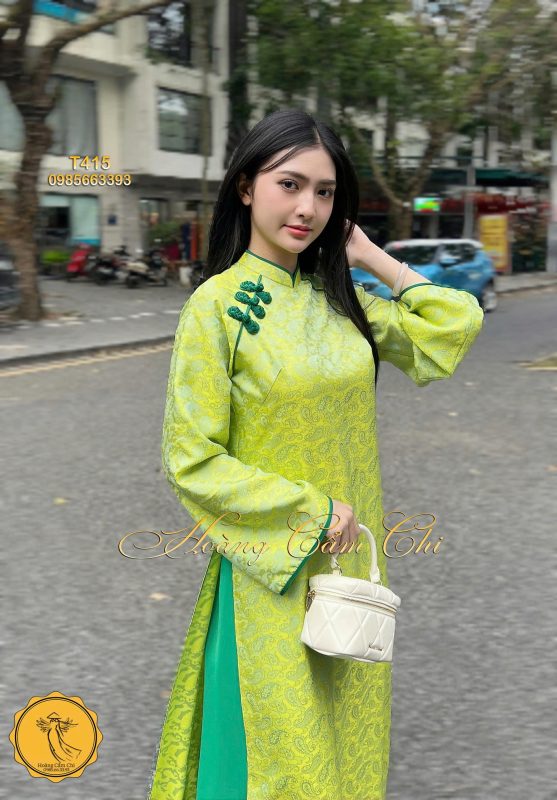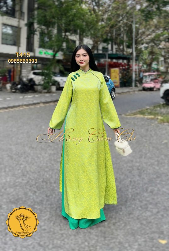Áo Dài 1415 – Tôn vinh vẻ đẹp truyền thống Việt Nam qua chất liệu gấm dệt hoa văn tinh xảo. Màu xanh lá chuối (Chartreuse) độc đáo, nổi bật giữa phố đông.
