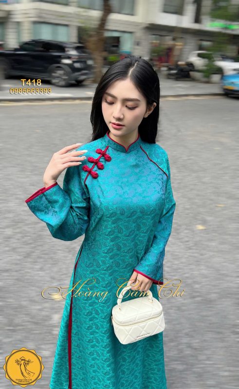Áo Dài T418 – Sự kết hợp hoàn hảo giữa vẻ đẹp truyền thống và tông màu Xanh Ngọc (Teal) hiếm có. Chất liệu gấm dệt hoa văn tinh xảo, nổi bật mọi góc nhìn.