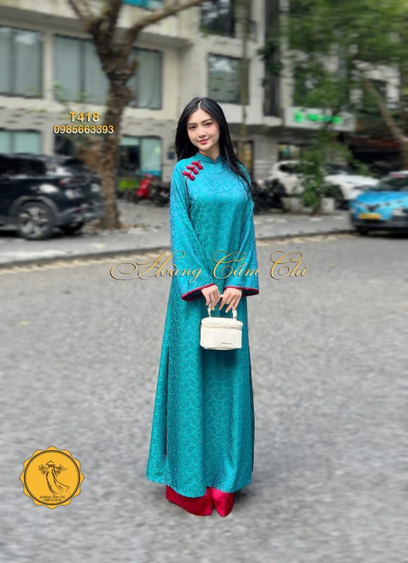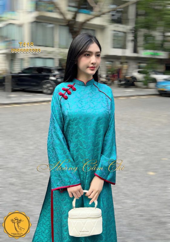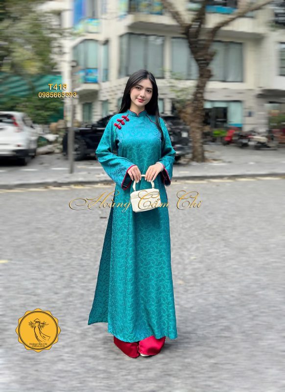 Áo Dài T418 – Sự kết hợp hoàn hảo giữa vẻ đẹp truyền thống và tông màu Xanh Ngọc (Teal) hiếm có. Chất liệu gấm dệt hoa văn tinh xảo, nổi bật mọi góc nhìn.