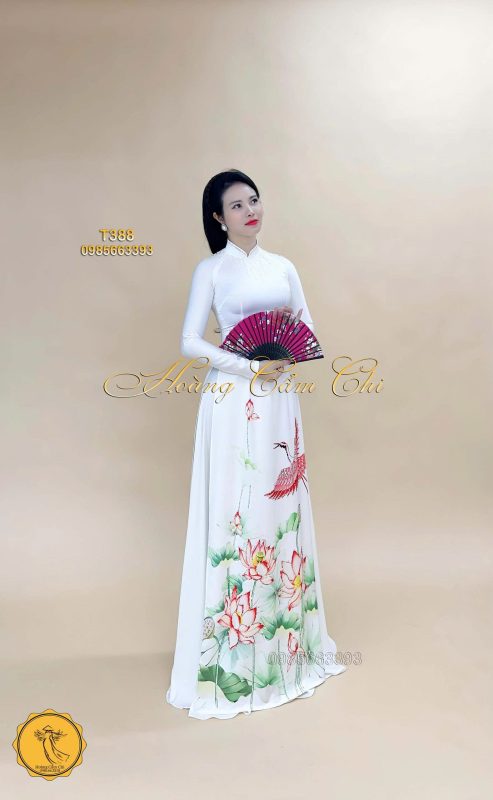 BST áo dài trắng với họa tiết hoa sen & chim hạc – biểu tượng cho vẻ đẹp thanh cao, thuần khiết của người phụ nữ Việt.