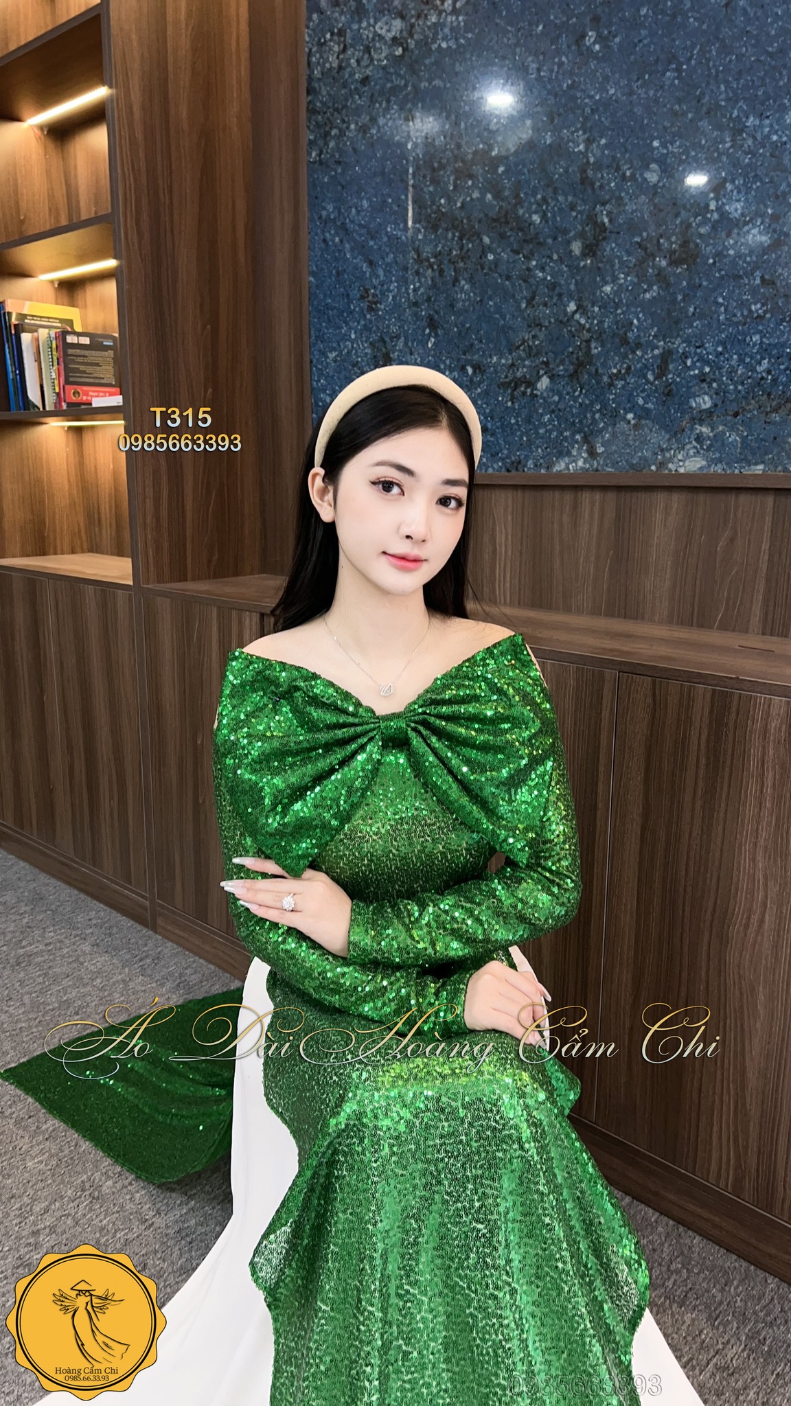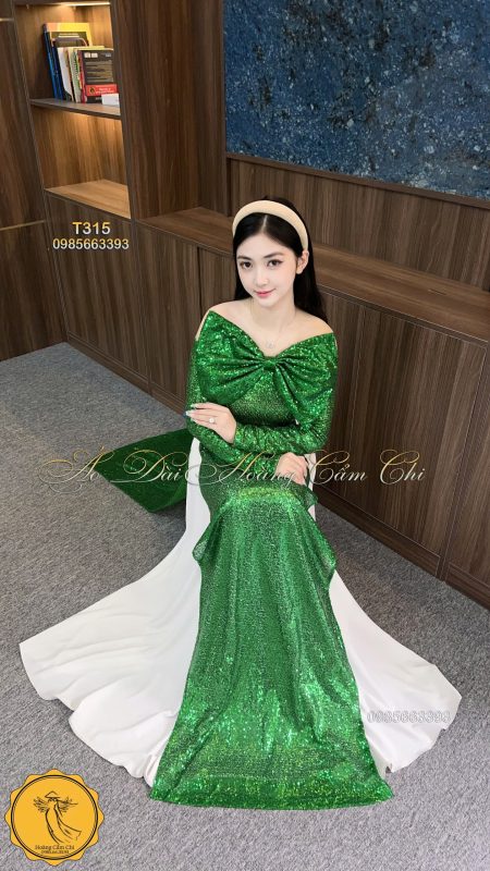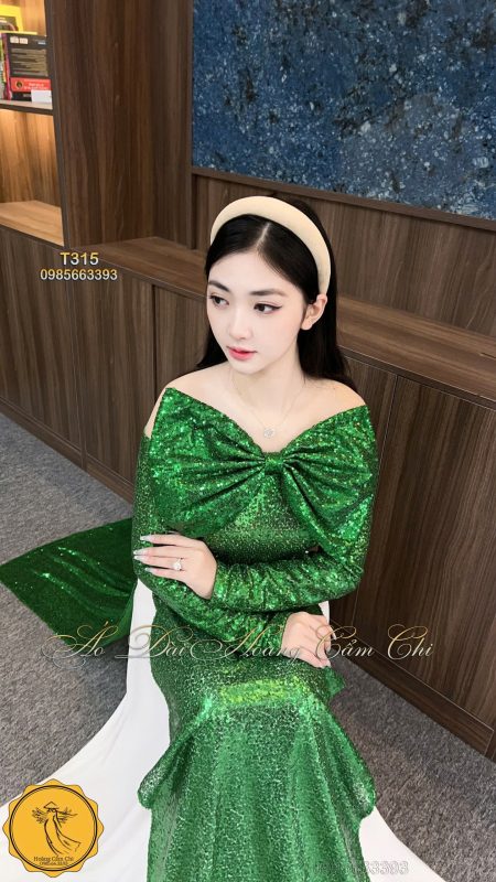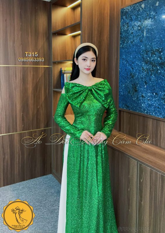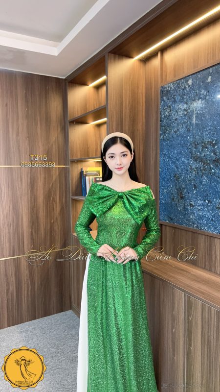 Chiếc áo dài được thiết kế từ chất liệu kim tuyến cao cấp, mang sắc xanh ngọc quyến rũ, nổi bật với phần nơ to bản trước ngực tạo điểm nhấn sang trọng. Dành riêng cho những quý cô yêu sự nổi bật và khí chất riêng!