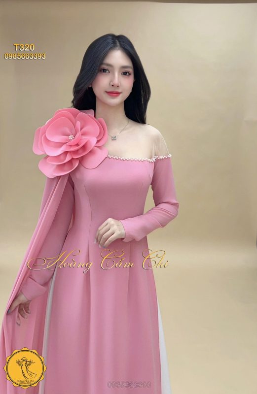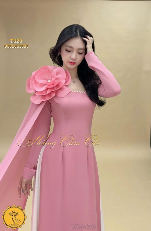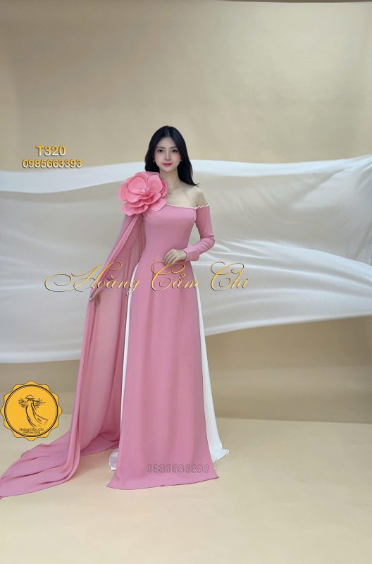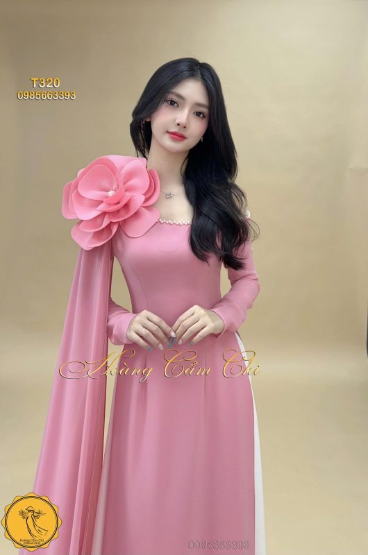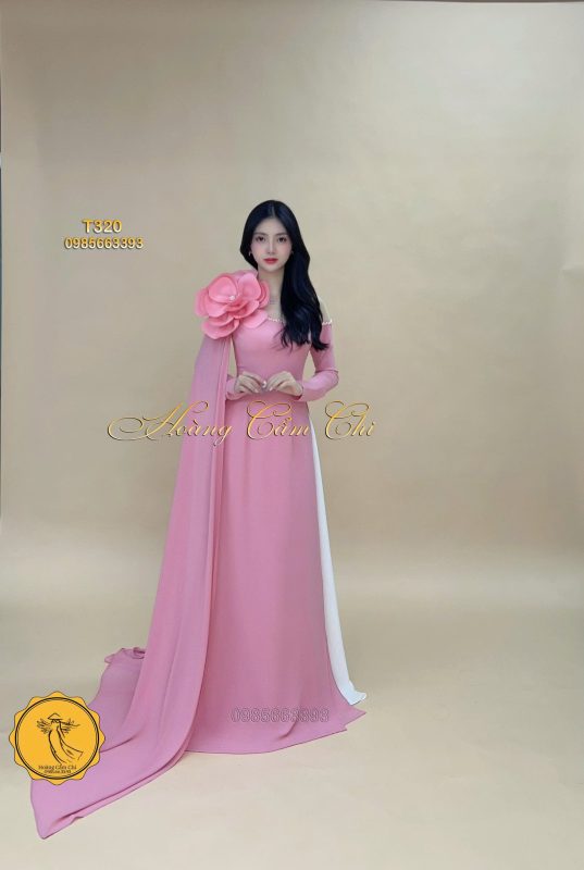 Áo dài thiết kế Đóa Hoa Kiêu Sa hồng baby mã T320 Hoàng Cẩm Chi