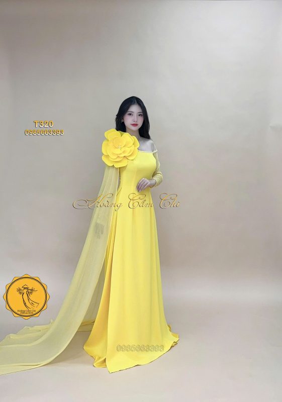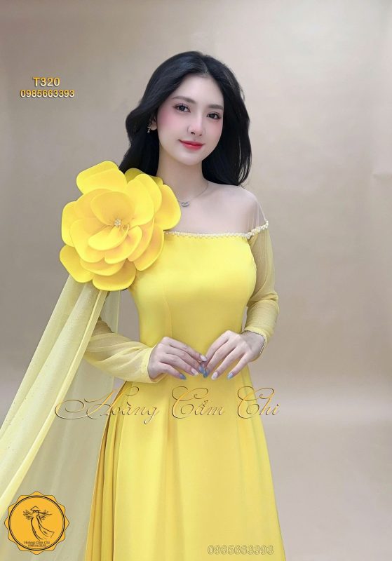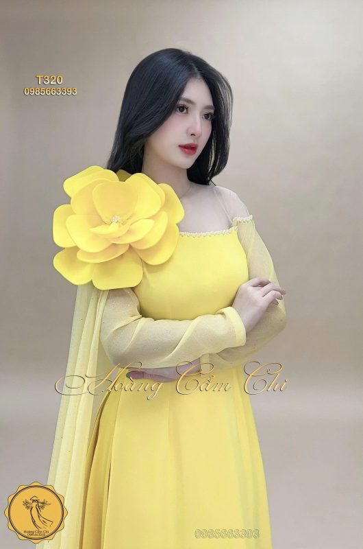 Áo dài thiết kế Đóa Hoa Kiêu Sa vàng tươi mã T320 Hoàng Cẩm Chi
