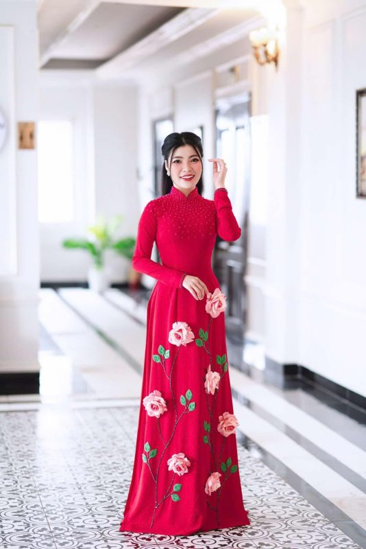 Một thiết kế đặc biệt dành riêng cho những ai yêu sự duyên dáng, nữ tính và nổi bật, mẫu áo dài đỏ đính hoa hồng 3D nổi tinh xảo mang đến vẻ đẹp vừa kiêu sa, vừa đậm chất truyền thống.