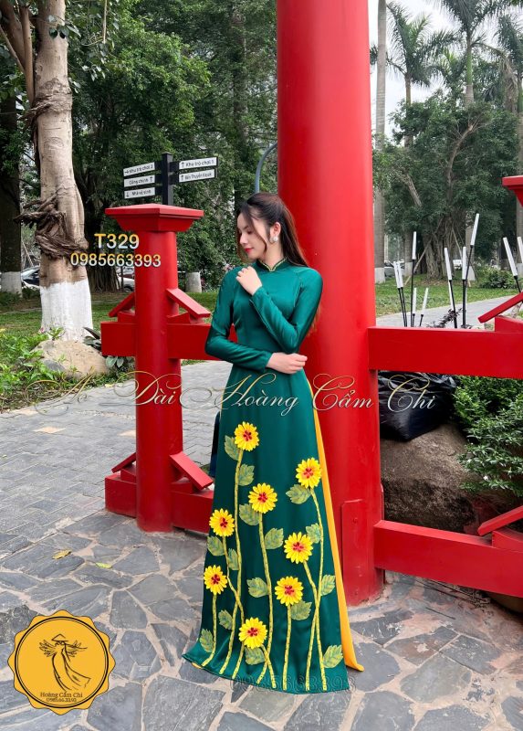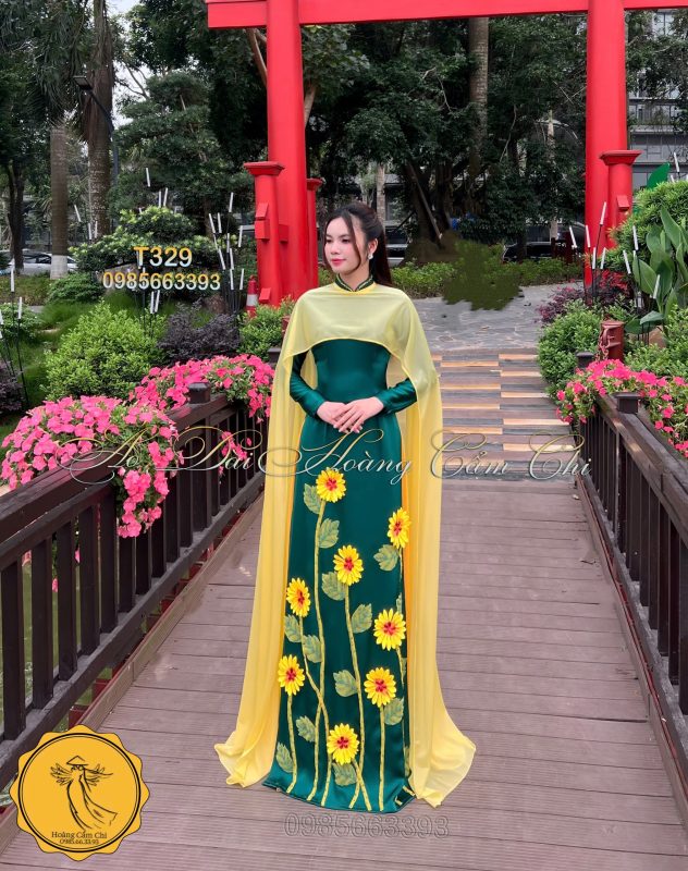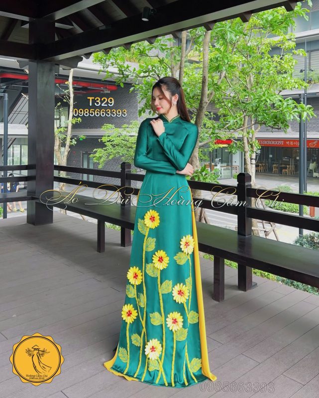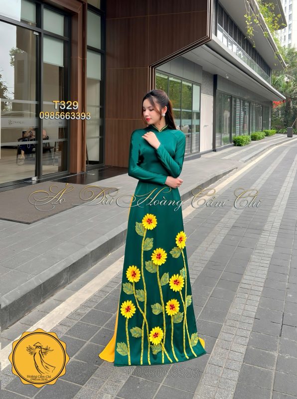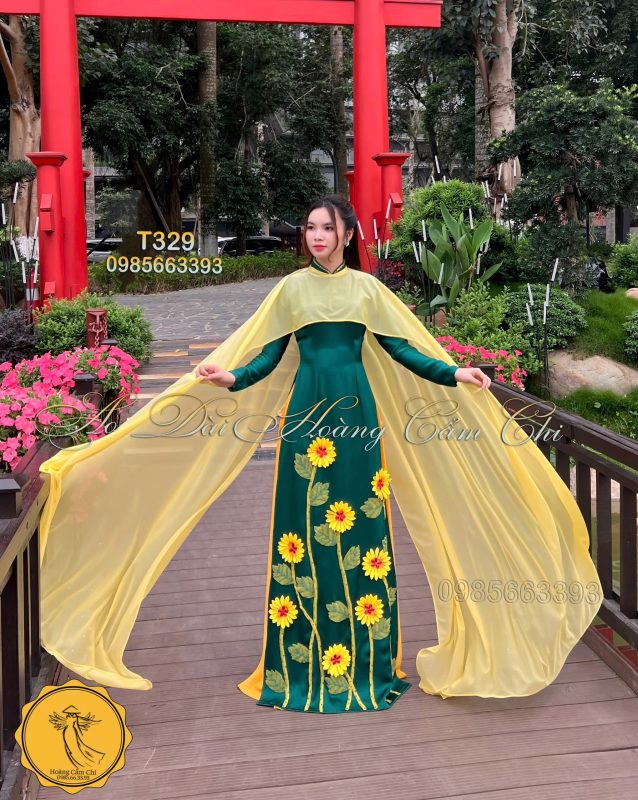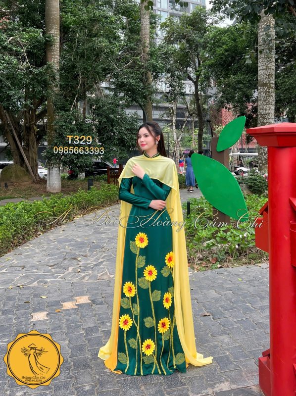Chiếc áo dài được thiết kế tinh tế với sắc xanh ngọc bích đậm, điểm xuyết họa tiết hoa hướng dương rực rỡ mang đến sức sống tràn đầy, tượng trưng cho sự kiên cường và tươi mới. Tà áo vàng mỏng nhẹ như cánh lụa bay bổng, hòa quyện cùng gió nhẹ tạo nên một bức tranh chuyển động đầy duyên dáng và mơ màng. Mỗi bước đi, mỗi cử chỉ của người mặc như kể một câu chuyện về nét đẹp truyền thống đan xen sự hiện đại, vừa thanh thoát vừa đầy cuốn hút, khiến ánh mắt không thể rời xa.