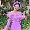 Mẫu áo dài thiết kế trễ vai phối voan mềm mại, chi tiết hoa cài ngực tinh tế giúp tôn lên bờ vai thon thả và vẻ đẹp hiện đại pha nét truyền thống.