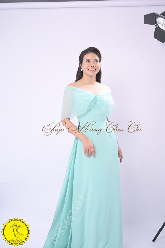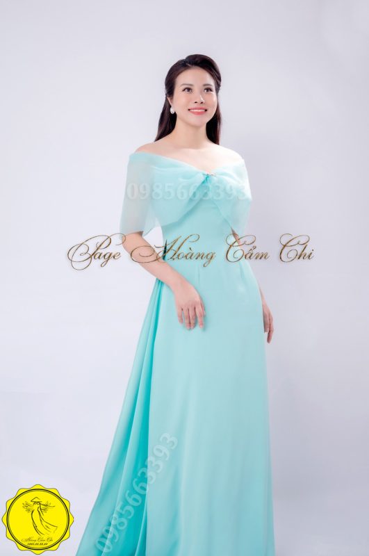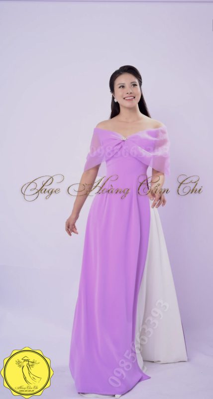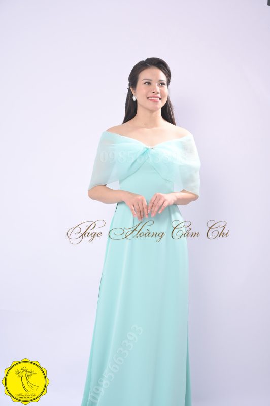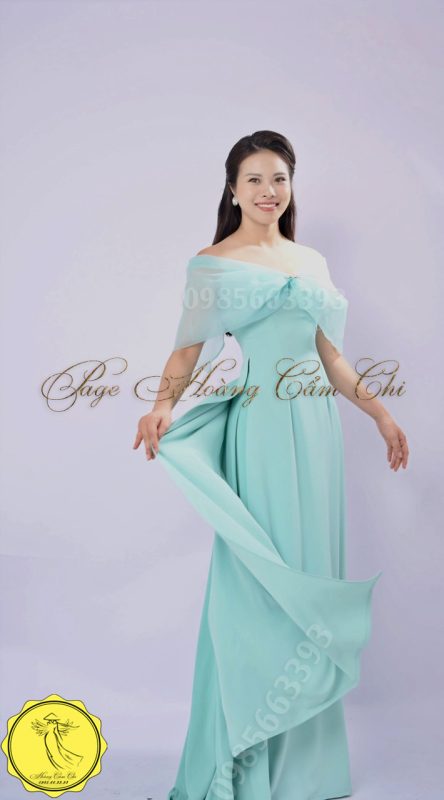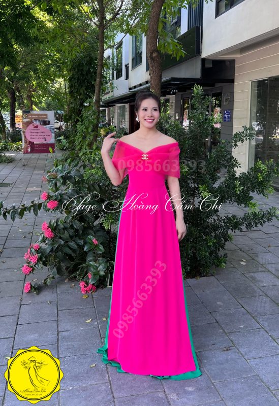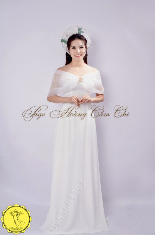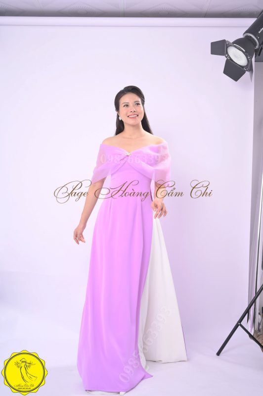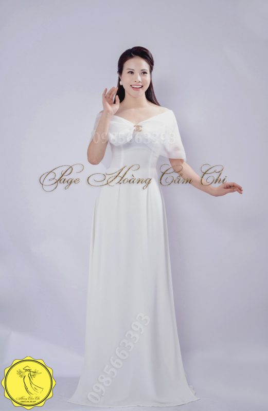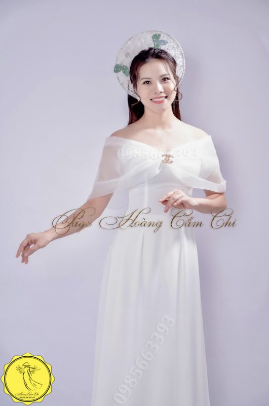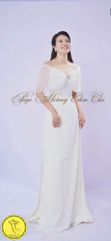 Mẫu áo dài thiết kế trễ vai phối voan mềm mại, chi tiết hoa cài ngực tinh tế giúp tôn lên bờ vai thon thả và vẻ đẹp hiện đại pha nét truyền thống.