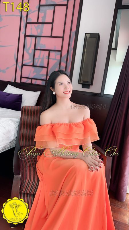 Áo dài thiết kế mã T148 màu cam Hoàng Cẩm Chi