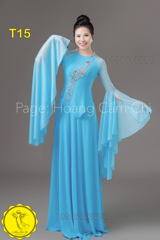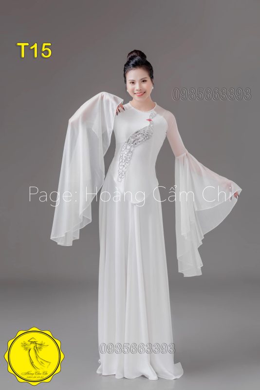 Mẫu áo dài T15 nổi bật với thiết kế tay lưới cách điệu và họa tiết chim công sang trọng, tôn lên vẻ đẹp nền nã và quý phái cho người mặc.