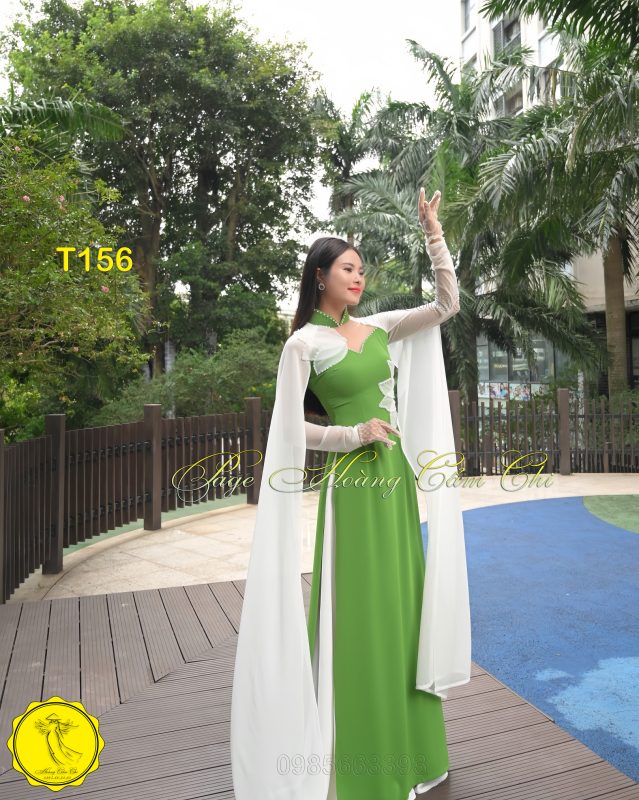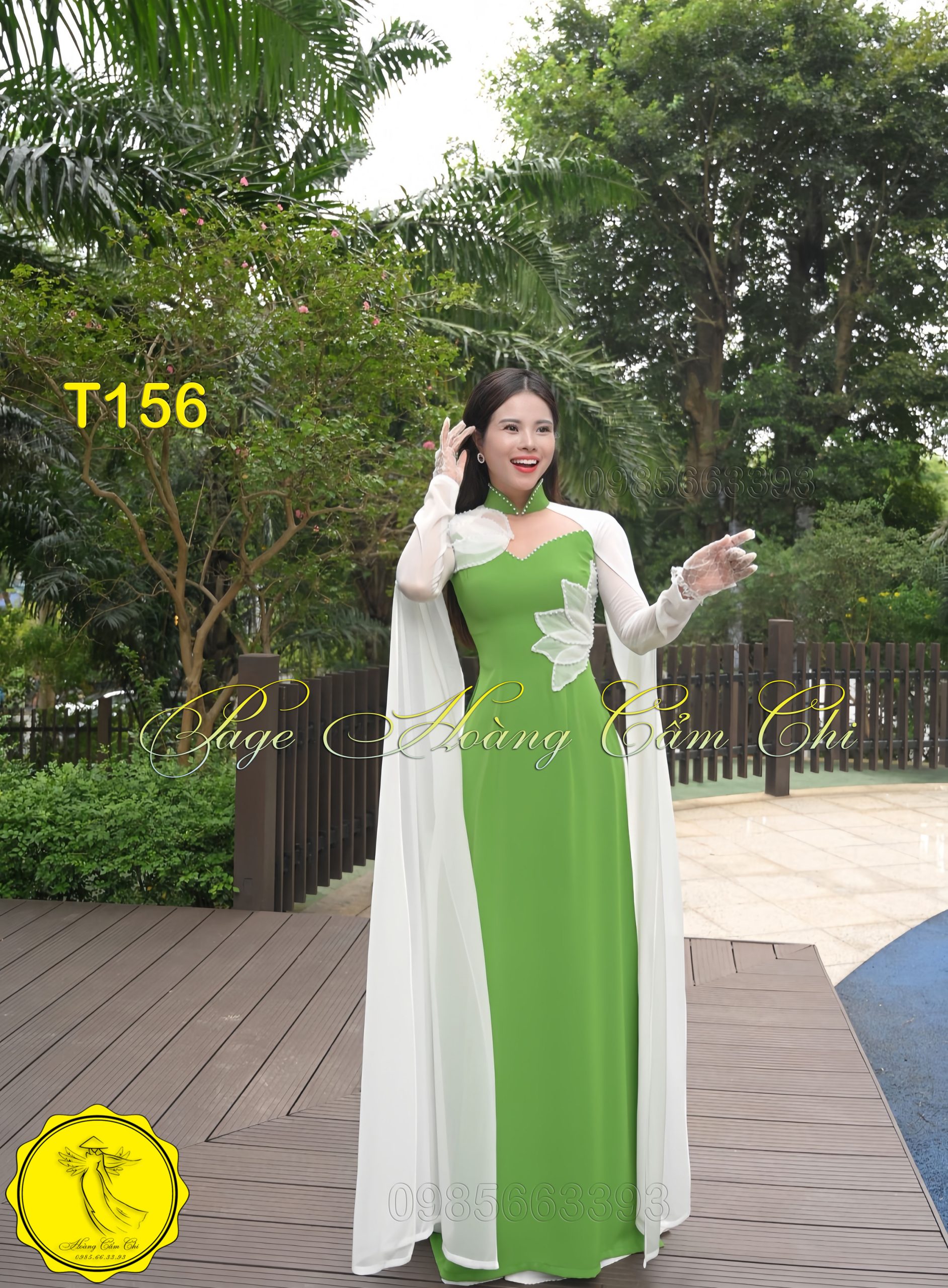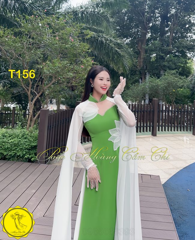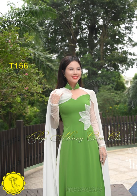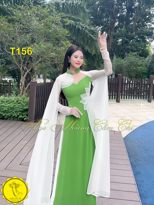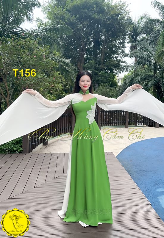 T156 – Mẫu áo dài xanh lá phối voan trắng tinh khôi, tôn lên nét đẹp nữ tính, duyên dáng cho mọi cô gái Việt.