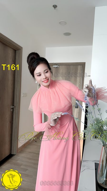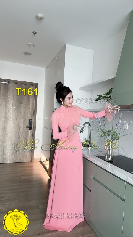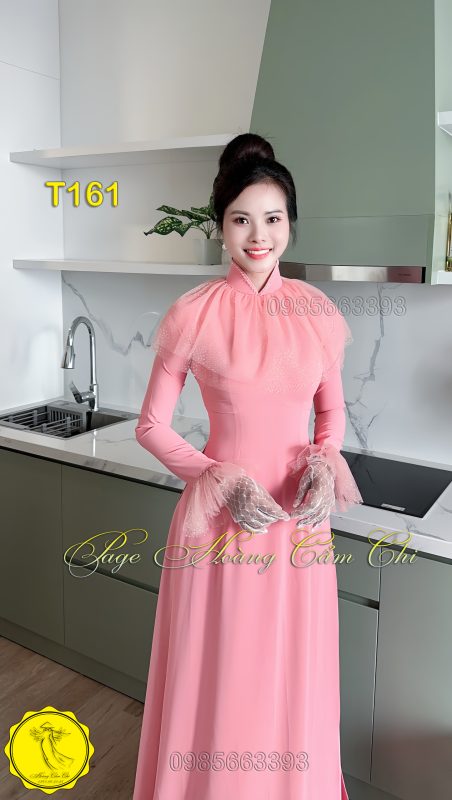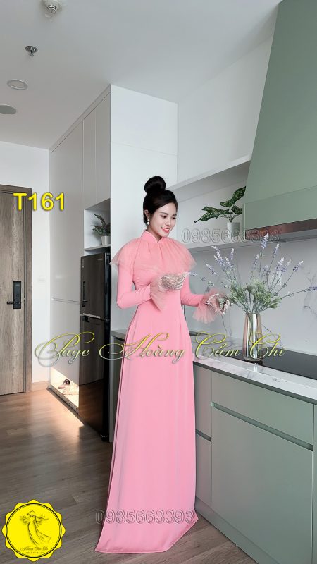 Tô điểm vẻ đẹp dịu dàng và thanh lịch bằng chiếc áo dài T161 với thiết kế cổ voan lãng mạn.