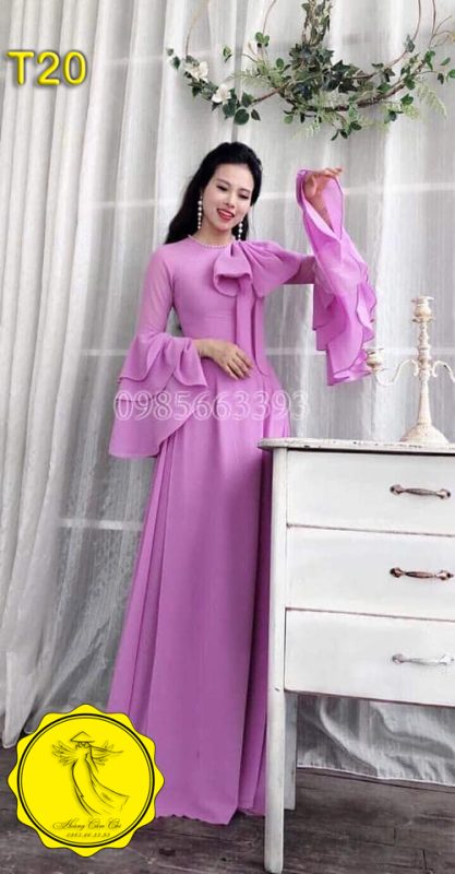 Tỏa sáng mọi ánh nhìn với mẫu áo dài T20 tone hồng tím dịu dàng, thiết kế tay tầng sang trọng và điểm nhấn nơ cổ tinh tế.