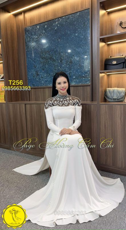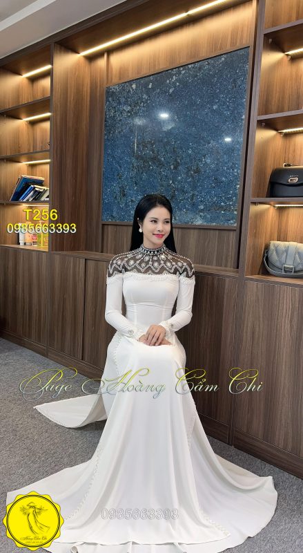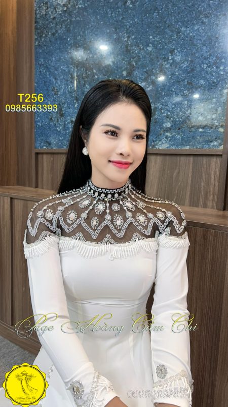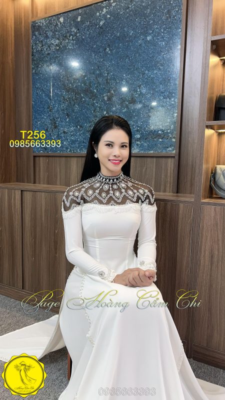 Mẫu áo dài trắng T256 mang đến vẻ đẹp cao sang với phần cổ ren đính ngọc và pha lê tỉ mỉ, thiết kế tinh tế từ thân áo đến tà, tạo nên một tổng thể vừa kiêu sa, vừa trang nhã. Lý tưởng cho cô dâu, MC, giáo viên hoặc sự kiện trang trọng.