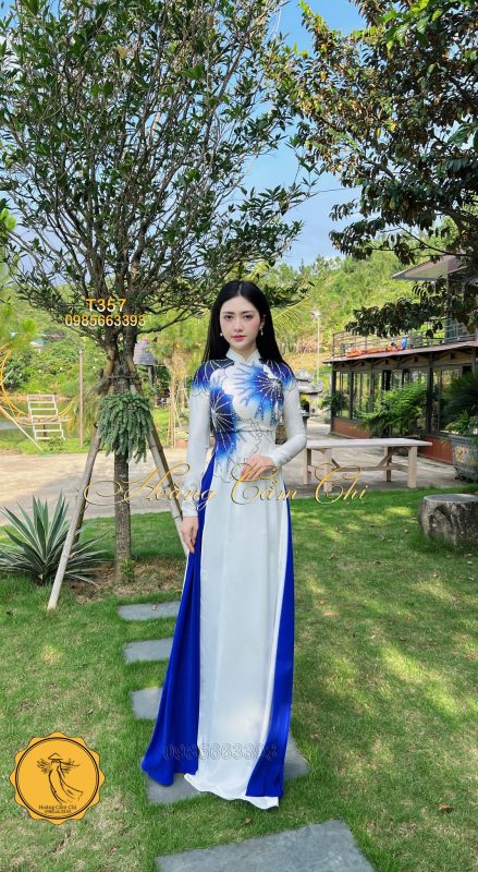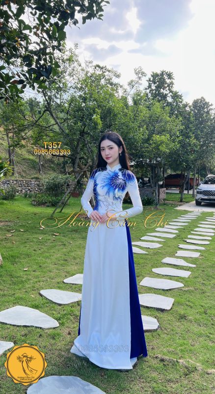 T357 là mẫu áo dài mang vẻ đẹp nền nã, dịu dàng nhưng không kém phần cuốn hút. Sự kết hợp hài hòa giữa gam trắng tinh khôi và sắc xanh nổi bật tạo nên tổng thể thanh thoát, hiện đại.