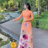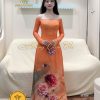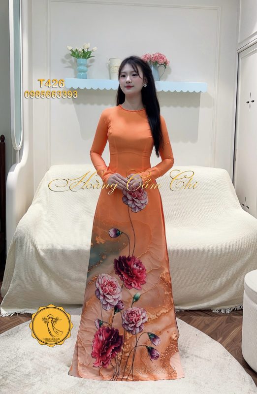 Màu cam đào rực rỡ, ấm áp kết hợp với họa tiết hoa mẫu đơn (hoặc hoa hồng lớn) in 3D sống động trên tà áo, tạo nên vẻ đẹp sang trọng và không kém phần nữ tính. Chiếc áo dài này là lựa chọn hoàn hảo cho những dịp đặc biệt, chụp hình Tết, hay đơn giản là làm mới tủ đồ của nàng!