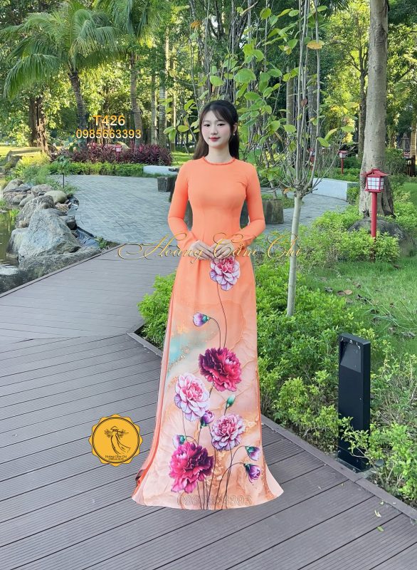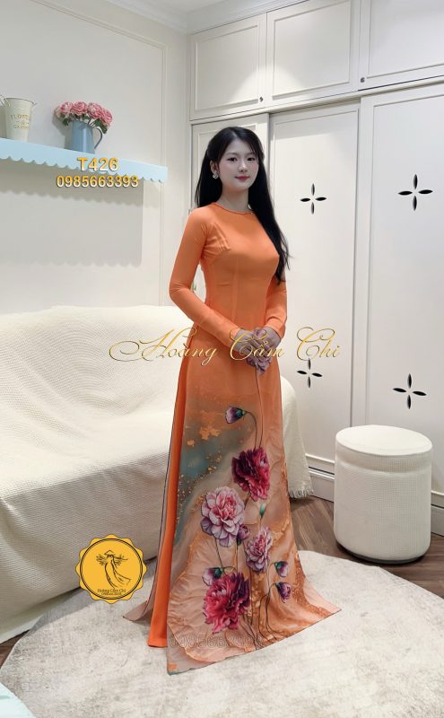 Màu cam đào rực rỡ, ấm áp kết hợp với họa tiết hoa mẫu đơn (hoặc hoa hồng lớn) in 3D sống động trên tà áo, tạo nên vẻ đẹp sang trọng và không kém phần nữ tính. Chiếc áo dài này là lựa chọn hoàn hảo cho những dịp đặc biệt, chụp hình Tết, hay đơn giản là làm mới tủ đồ của nàng!