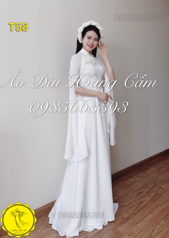 Mẫu áo dài T58 với sắc trắng thuần khiết, thiết kế vai choàng độc đáo và hoa 3D nổi bật, mang lại vẻ đẹp vừa hiện đại vừa cổ điển, lý tưởng cho nàng diện trong ngày trọng đại 🤍