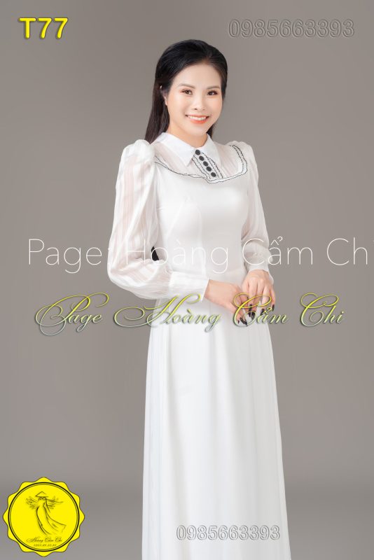 Áo dài T77 mang tone trắng tinh khôi, kết hợp thiết kế cổ sơ mi phá cách, phù hợp cho nàng diện đi làm, chụp kỷ yếu hoặc các dịp trang trọng.