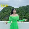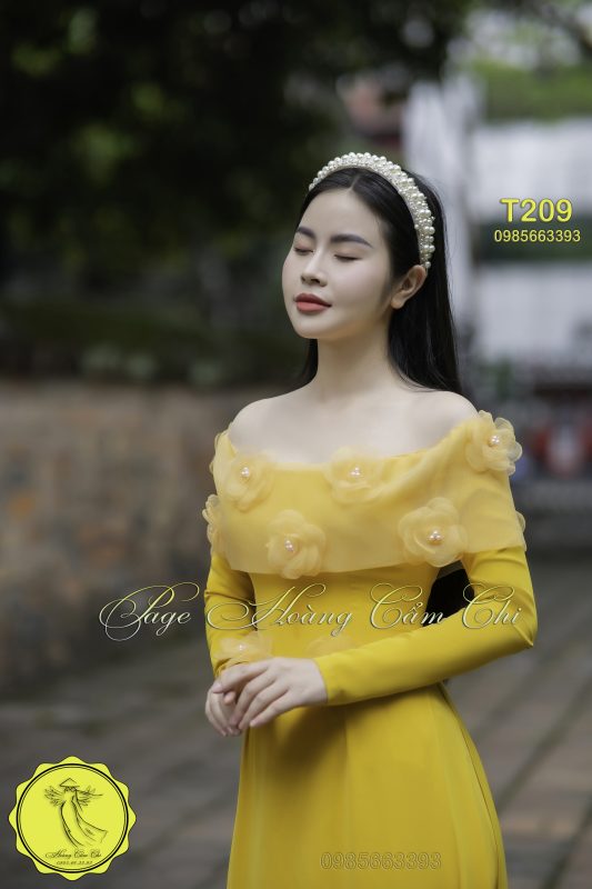 Mẫu áo dài T209 với thiết kế trễ vai độc đáo, kết hoa nổi tinh tế, mang lại vẻ đẹp yêu kiều và đầy nữ tính cho người mặc.
