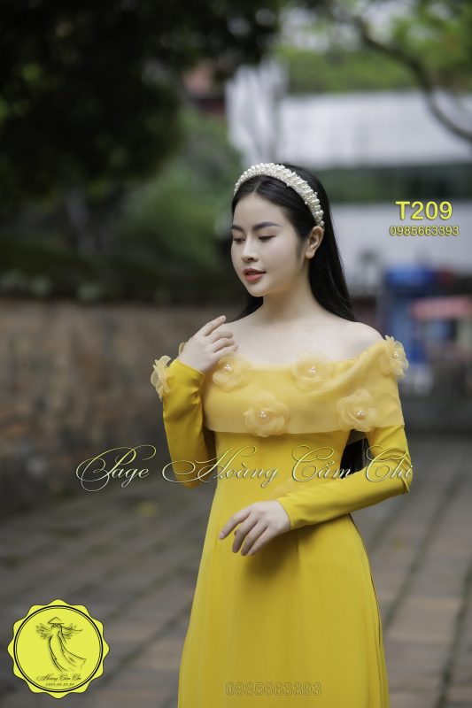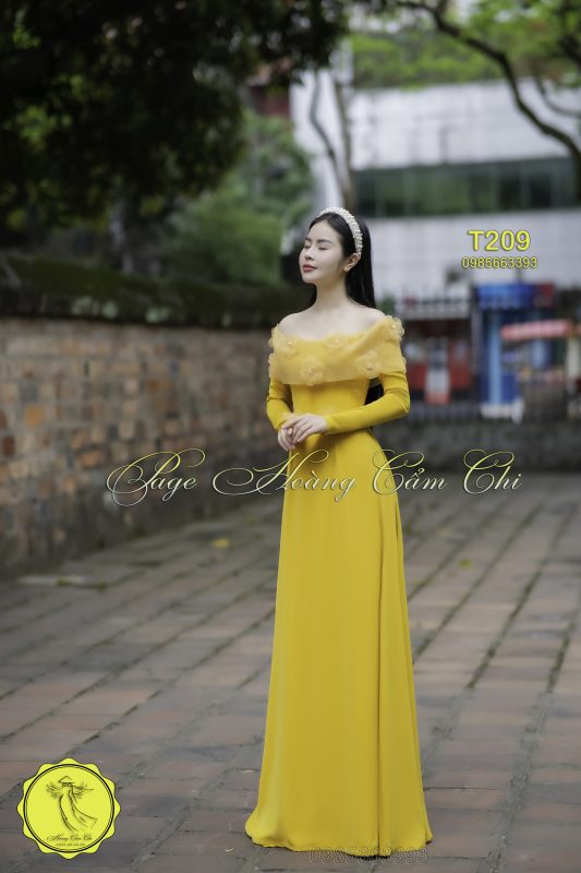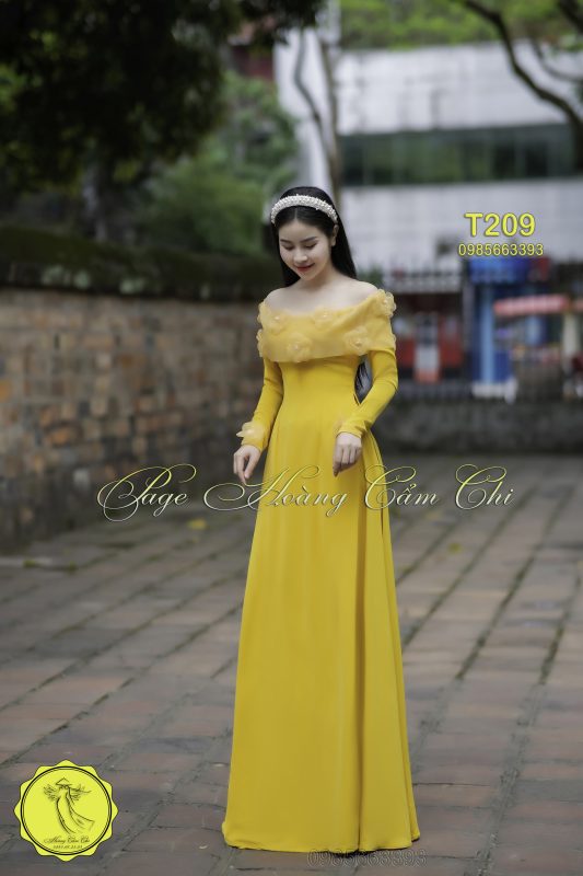 Mẫu áo dài T209 với thiết kế trễ vai độc đáo, kết hoa nổi tinh tế, mang lại vẻ đẹp yêu kiều và đầy nữ tính cho người mặc.