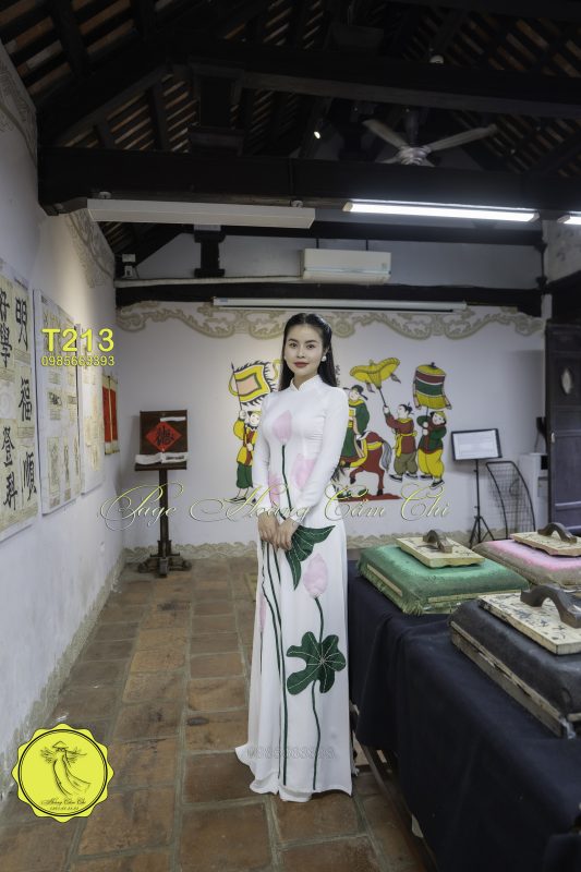 Áo dài T213 – Sen Việt Truyền Thống là mẫu thiết kế đặc trưng dành cho các dịp lễ trang trọng, với điểm nhấn độc đáo từ họa tiết hoa sen nổi bật: