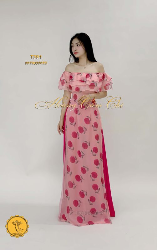 🌹 Thiết kế: Áo dài cách tân với họa tiết hoa hồng nổi bật, tay áo bèo tầng điệu đà