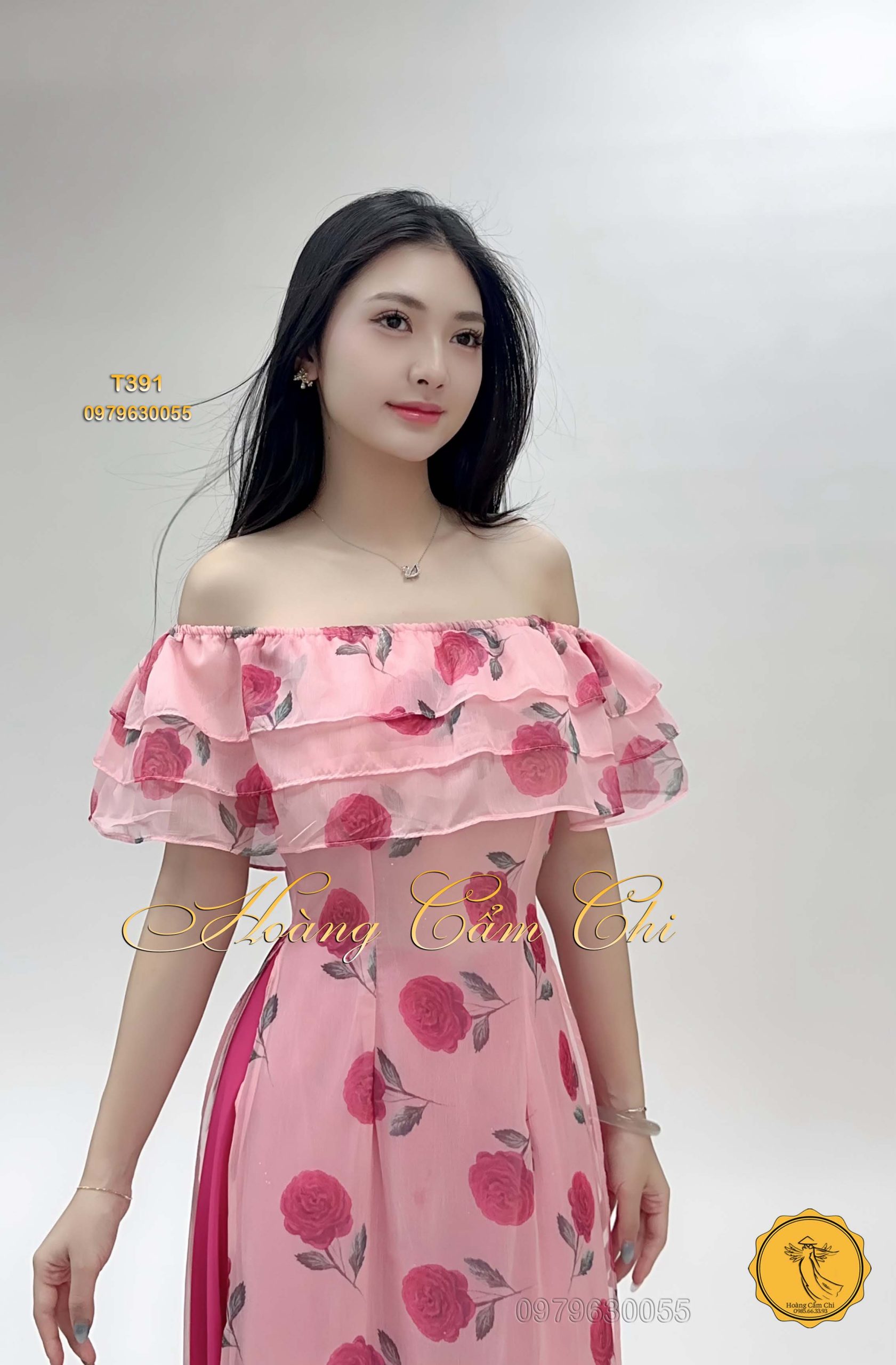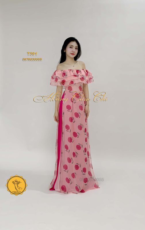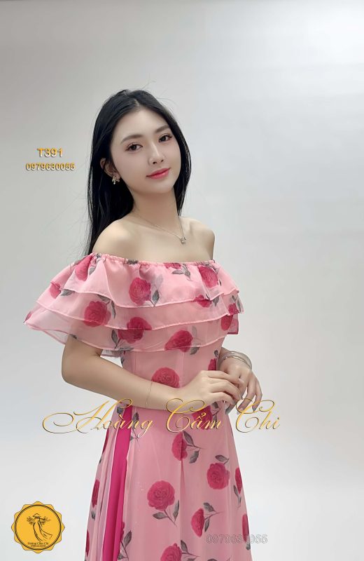 🌹 Thiết kế: Áo dài cách tân với họa tiết hoa hồng nổi bật, tay áo bèo tầng điệu đà
