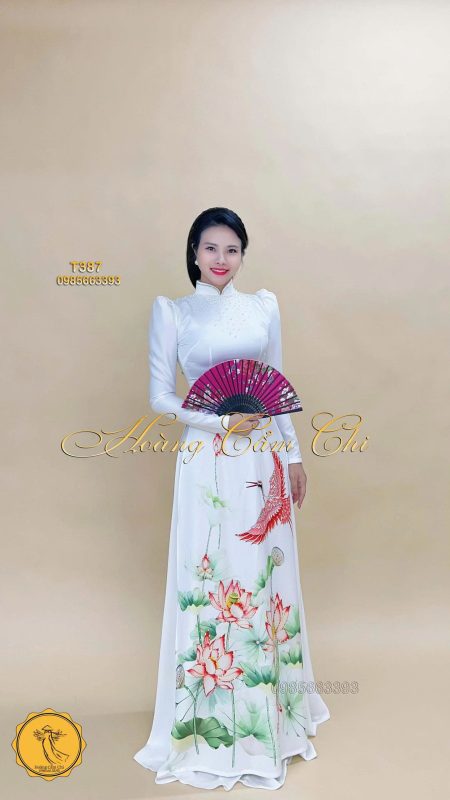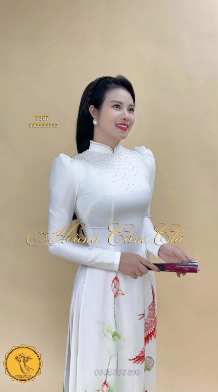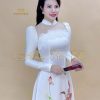 BST áo dài trắng với họa tiết hoa sen & chim hạc – biểu tượng cho vẻ đẹp thanh cao, thuần khiết của người phụ nữ Việt.