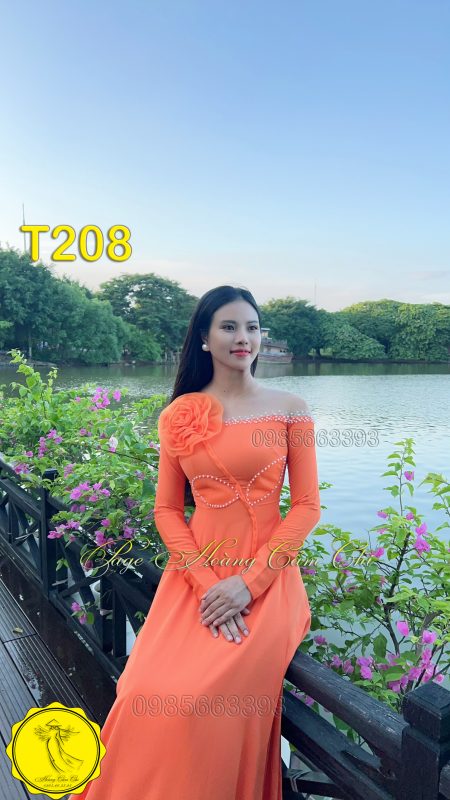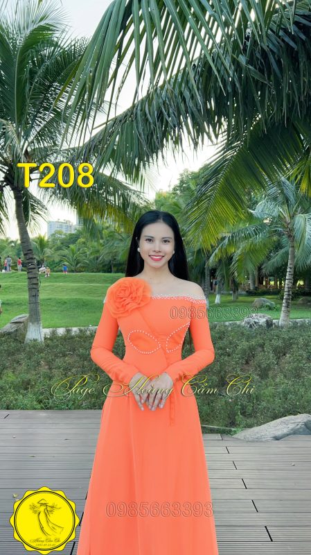 Áo dài thiết kế Vân Ca màu cà rốt mã T208 Hoàng Cẩm Chi