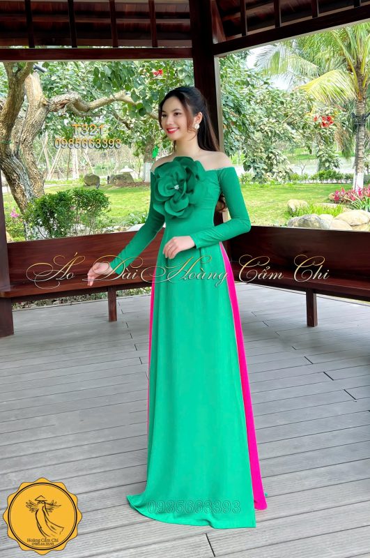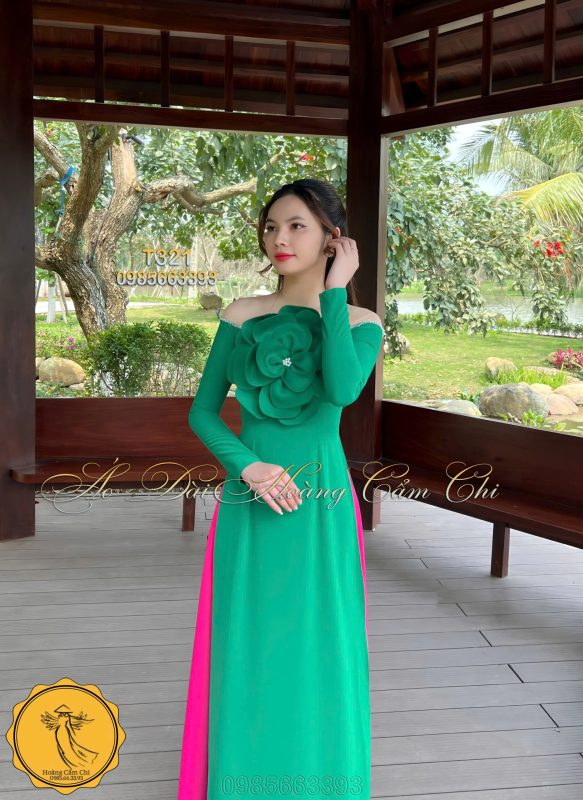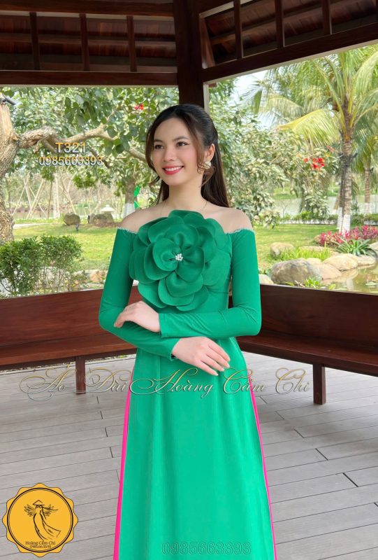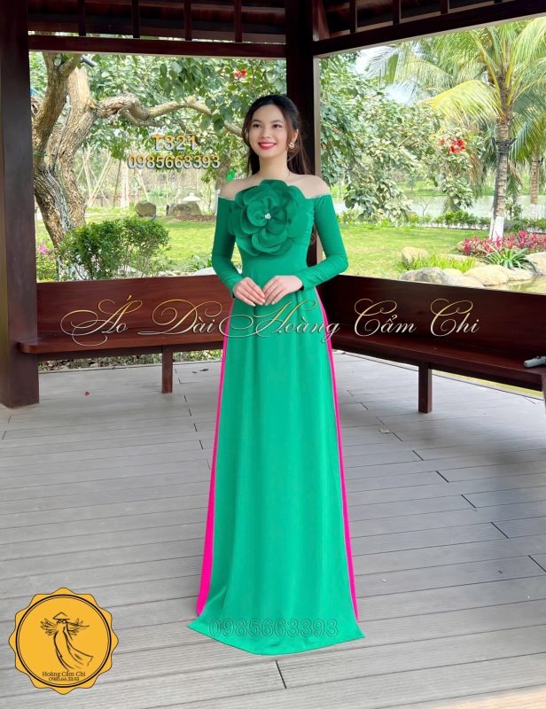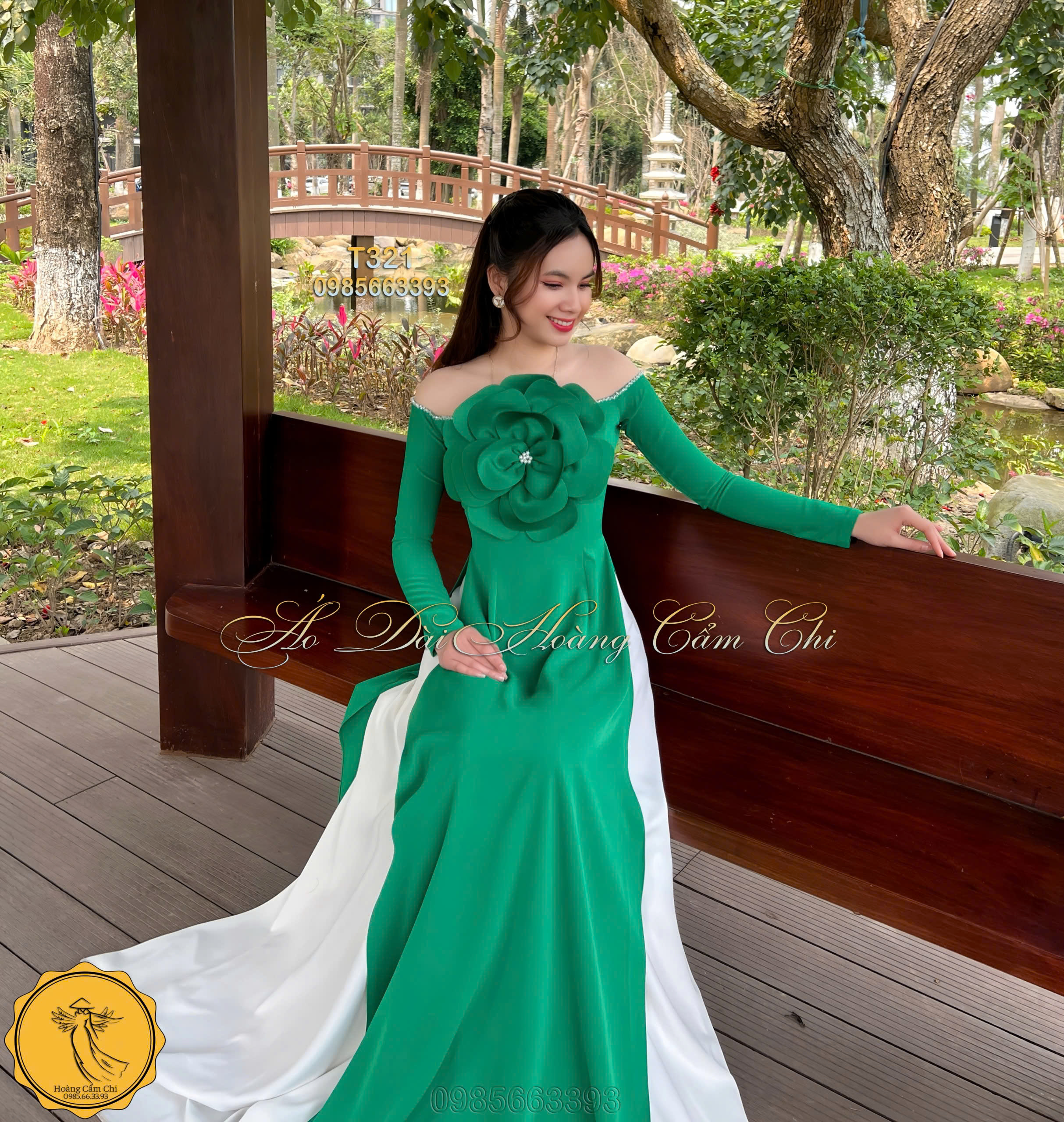 Khoác lên mình vẻ đẹp truyền thống kết hợp nét hiện đại tinh tế, mẫu áo dài dạ hội trễ vai đính hoa 3D là lựa chọn hoàn hảo cho những dịp đặc biệt. Thiết kế nổi bật với bông hoa lớn thủ công tạo điểm nhấn duyên dáng nơi ngực áo, giúp tôn lên vẻ đẹp thanh thoát, nữ tính của người mặc.