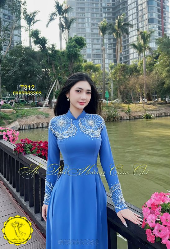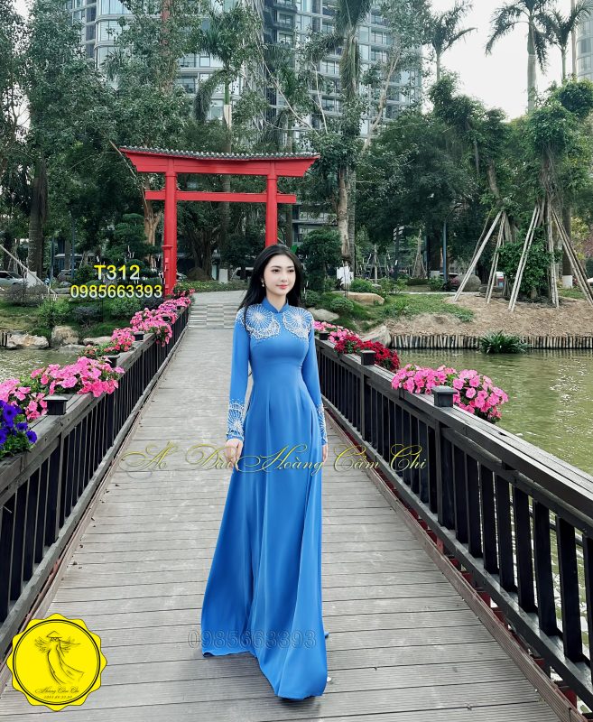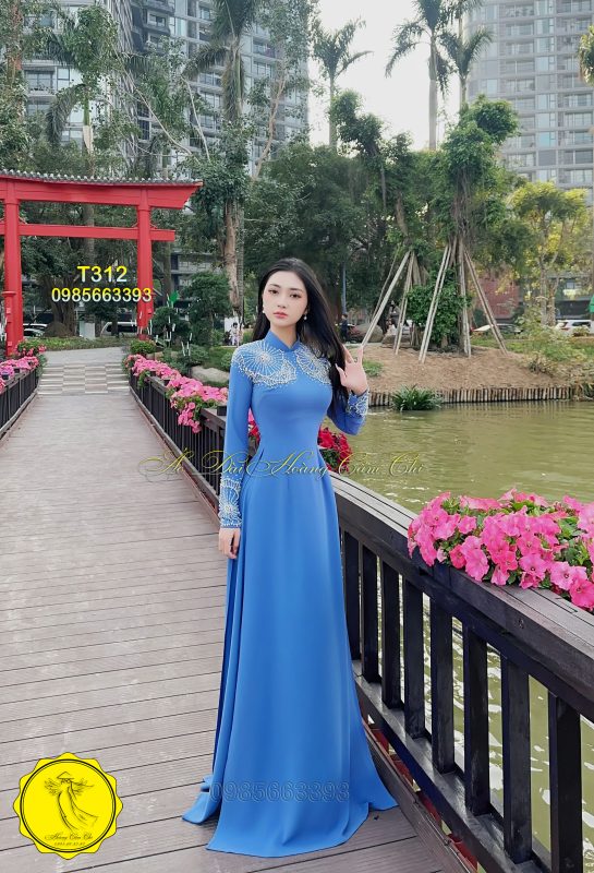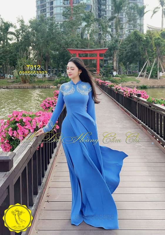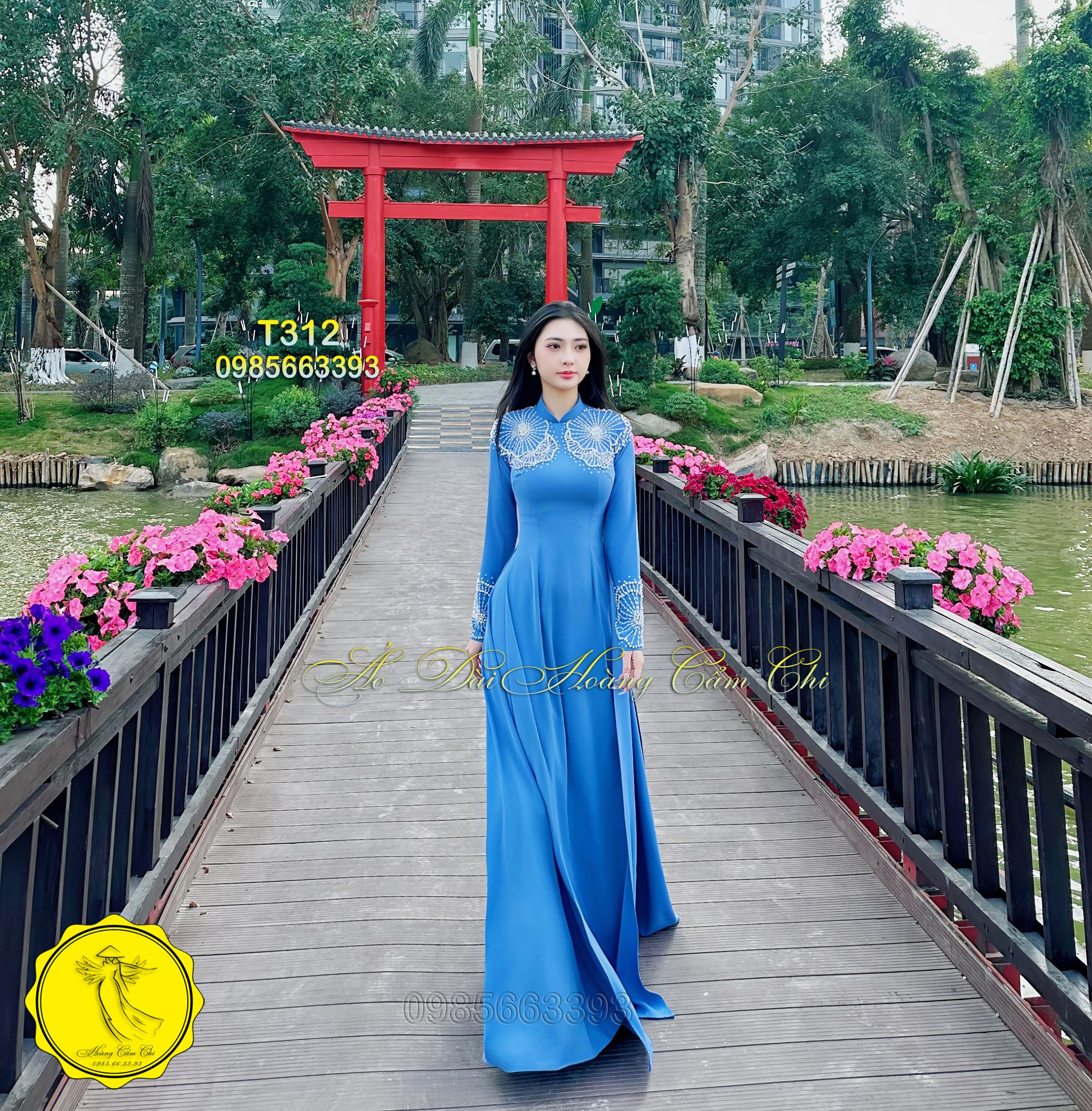 Áo dài thiết kế Đóa Hoa Kiêu Sa xanh mã T320 Hoàng Cẩm Chi