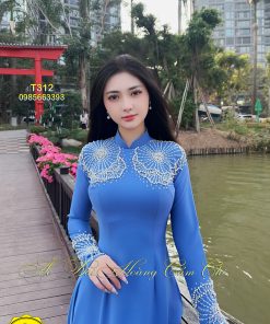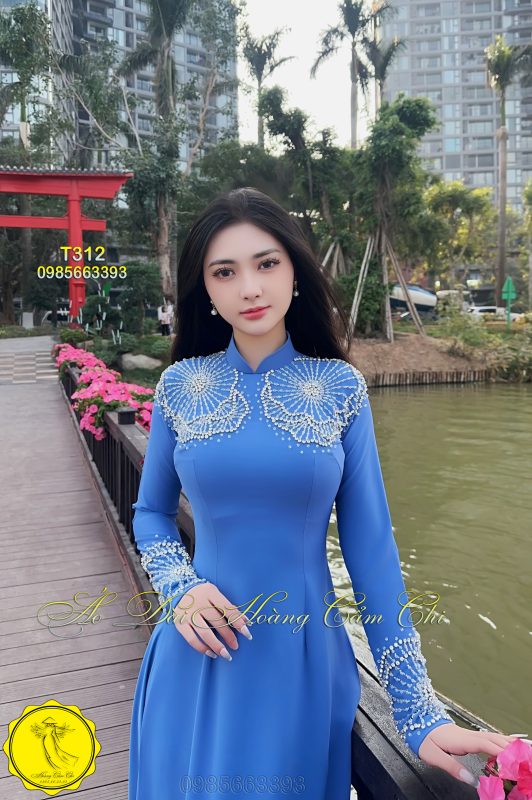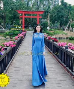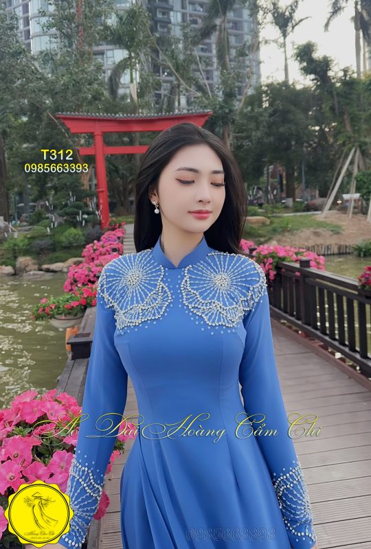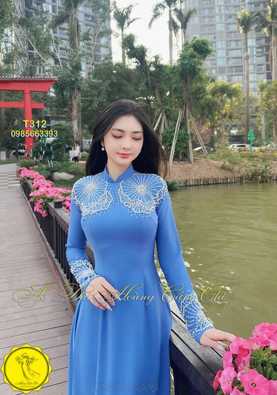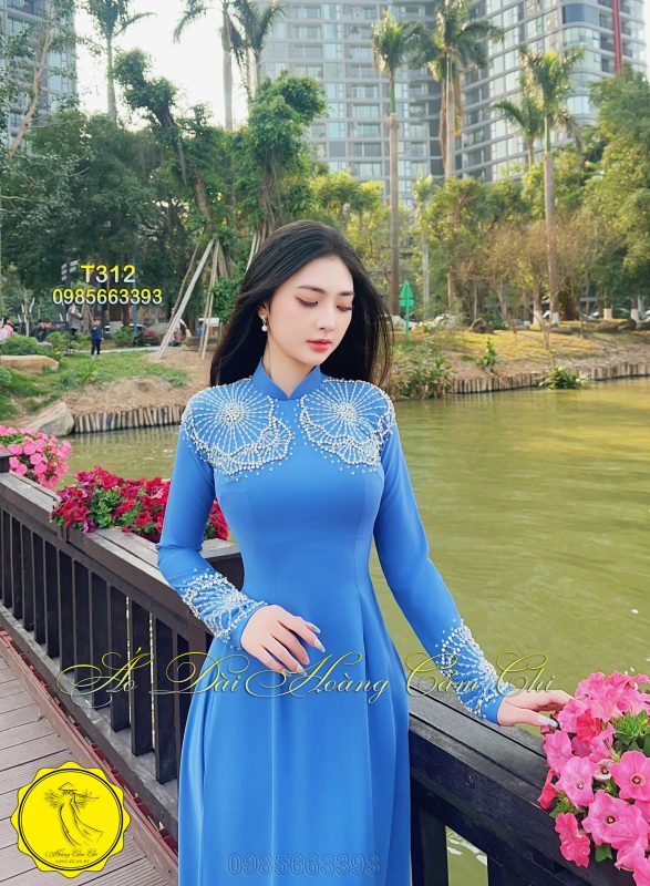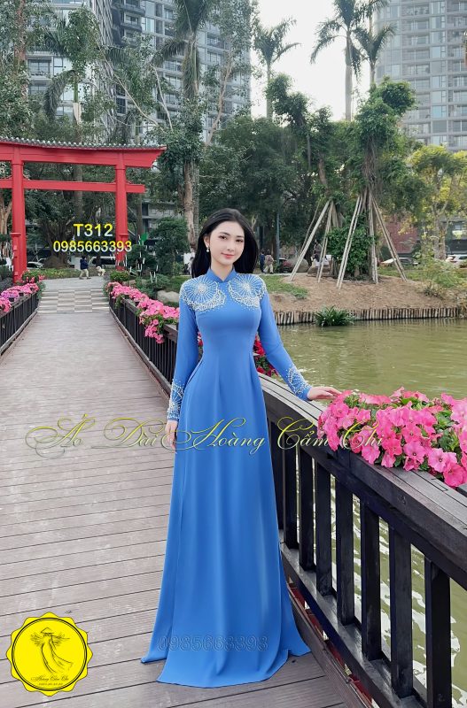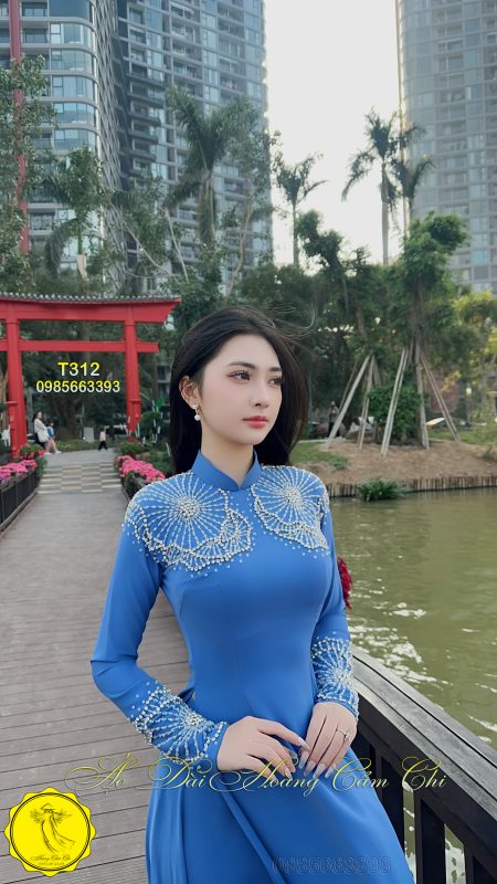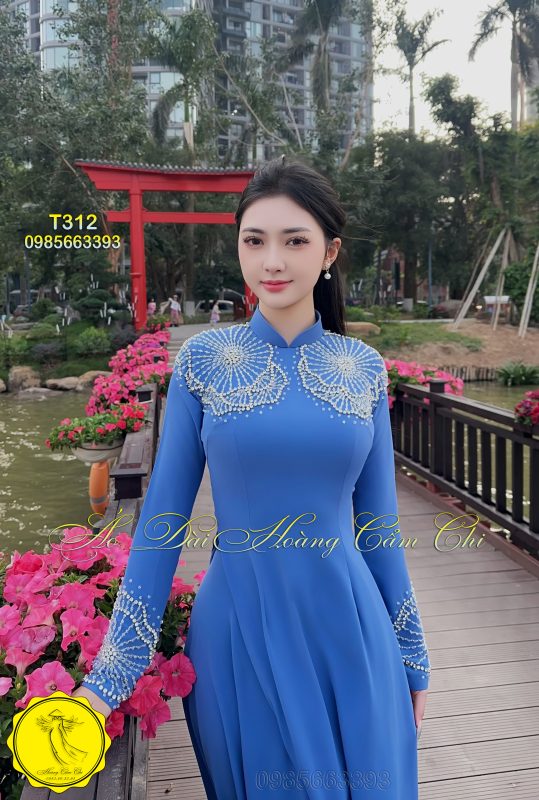 Áo dài thiết kế Đóa Hoa Kiêu Sa xanh mã T320 Hoàng Cẩm Chi